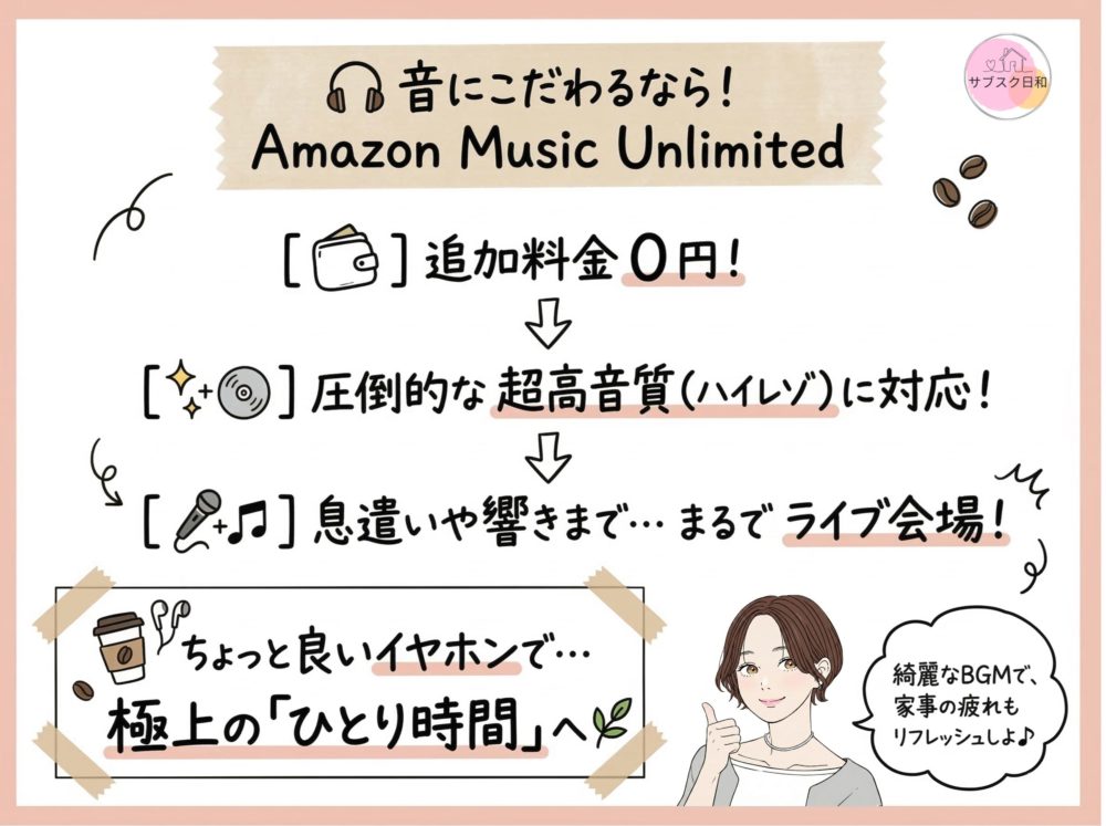 「毎月数百円多く払ってでも、極上の音質で日々の疲れを癒やしたい!」という明確な目的があるなら、非会員でもAmazonを選ぶ価値は十分にありますよ!